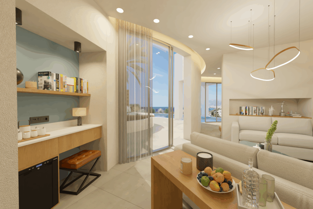 Ολοκληρωμένος εσωτερικός σχεδιασμός βιλών, με στόχο τη δημιουργία σύγχρονων, κομψών και άνετων χώρων διαμονής, εμπνευσμένων από το φυσικό τοπίο της περιοχής.